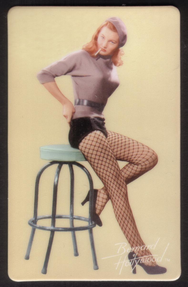 This collectible entertainment phone card features a photographic image of June McCall, a pinup model, captured by Bernard of Hollywood. June McCall is seated on a metal stool with a light blue cushioned seat. She wears a grey long-sleeve top paired with black high-waisted shorts, bold fishnet stockings, and black high-heeled shoes. She is posed with a cigarette in her mouth, adding a classic Hollywood allure to the scene.