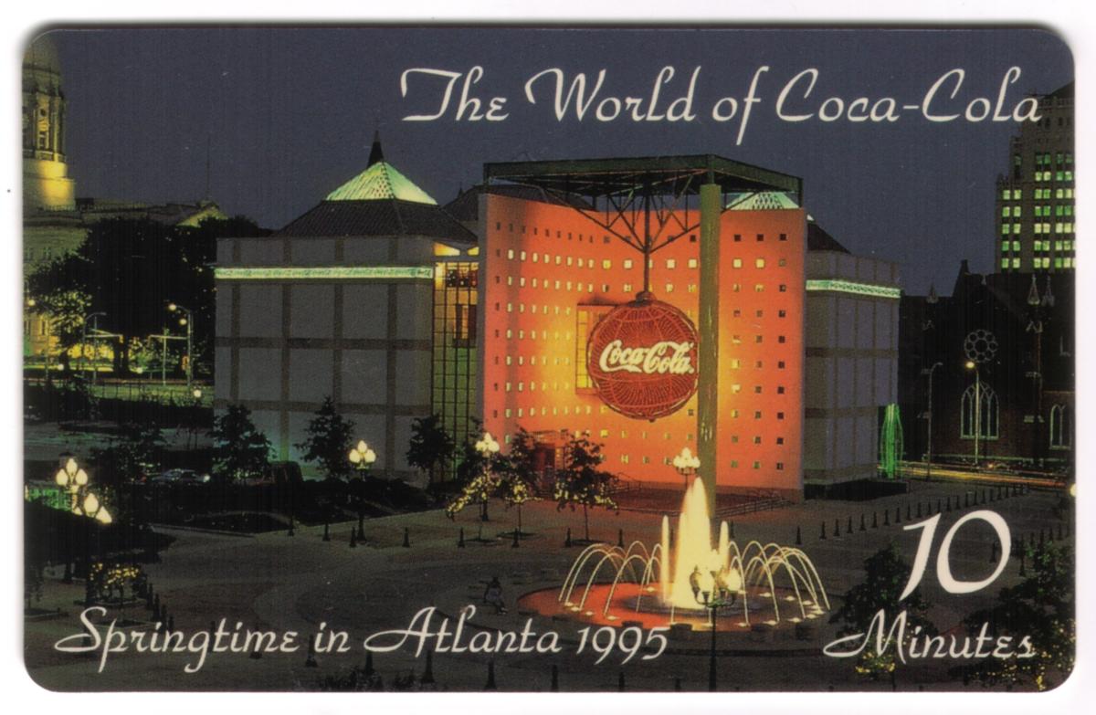 The card includes white script text at the top reading "The World of Coca-Cola" and cursive text at the bottom left stating "Springtime in Atlanta 1995." The lower right corner displays the card’s value, marked as "10 Minutes" in a clear white font. This phone card captures a specific moment in time, emphasizing the cultural and historic significance of the World of Coca-Cola attraction during spring 1995.