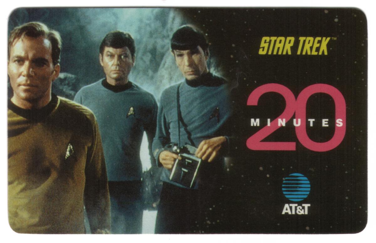 This phone card is a collectible edition linked to Star Trek: The Original Series, capturing the iconic trio of Kirk, Spock, and McCoy. It connects to sci-fi entertainment and television history through its clear reference to the influential TV show and its stars.