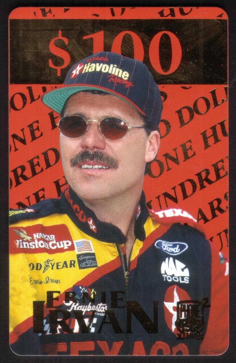 Prominent text includes references to NASCAR and the specific sponsors involved, such as Texaco, Havoline, Ford, and other automotive brands vital to racing culture. The card’s value is $100, indicating its collectible and functional nature within the PhonePak 2 series issued in 1997. This card serves as a tribute to Ernie Irvan’s contribution to the Winston Cup and represents both racing enthusiasts and collectors interested in automotive sports memorabilia.