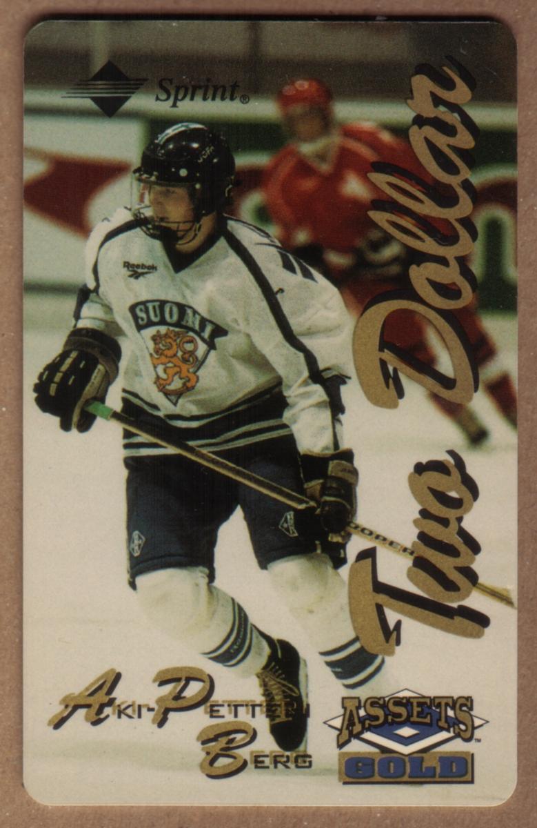 The card is branded with the Sprint logo in the upper left corner and displays the words "Tuoa Dollar" in large, gold cursive text along the right side. At the bottom, Aki-Petteri Berg's name appears in stylized gold and black text, alongside the "Assets Gold" logo in blue and gold, indicating the card's collection or series. The overall design combines sports action imagery with elegant typography, highlighting the prominence of Aki-Petteri Berg as an NHL hockey player.