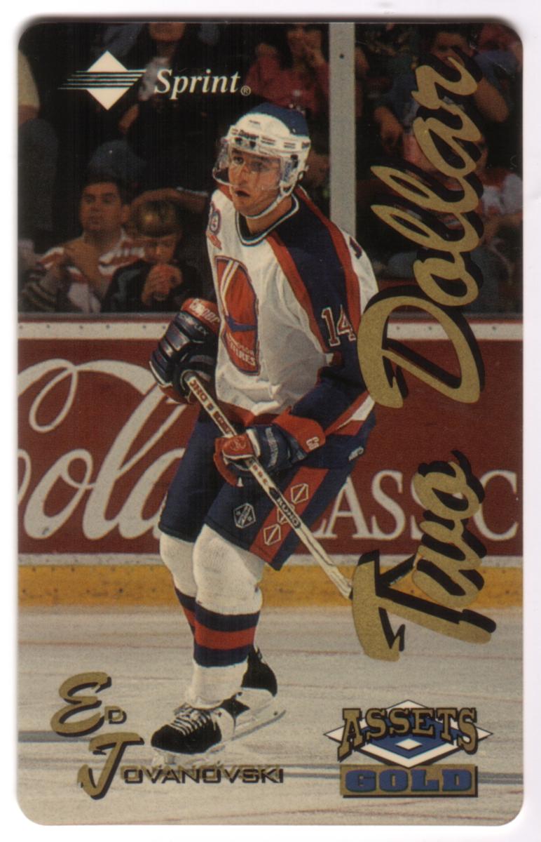The card displays the Sprint logo in the upper left corner. The text “Two Dollar” is written vertically in elegant gold script along the right side of the card. At the bottom left, the name "Ed Jovanovski" appears in black, stylized lettering with "Ed" in script and "JOVANOVSKI" in block letters. Near the bottom right corner is the "Assets Gold" logo, featuring the word "ASSETS" in gold with a blue banner below that reads "GOLD."