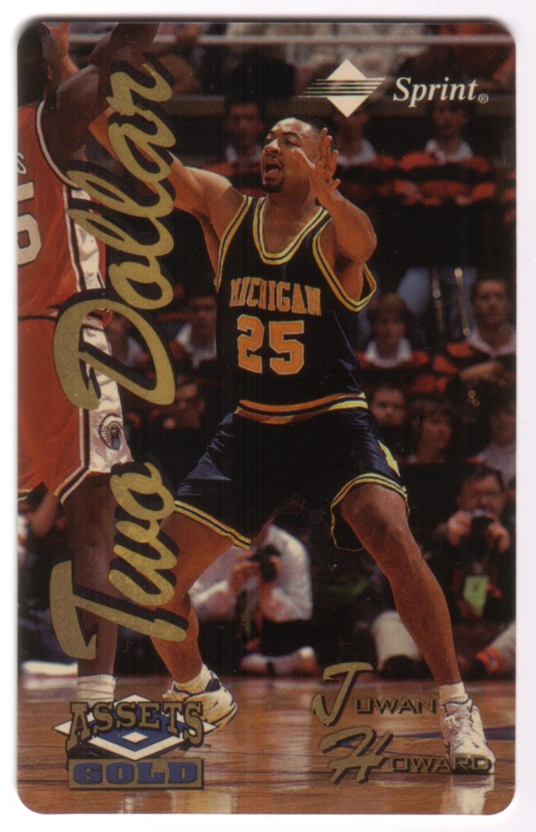 This collectible phone card features Juwan Howard, a professional basketball player wearing a University of Michigan Wolverines uniform with the number 25. He is shown in an on-court action pose, guarding or preparing to defend an opponent during a game. The card emphasizes basketball as it relates to the NBA and basketball players.