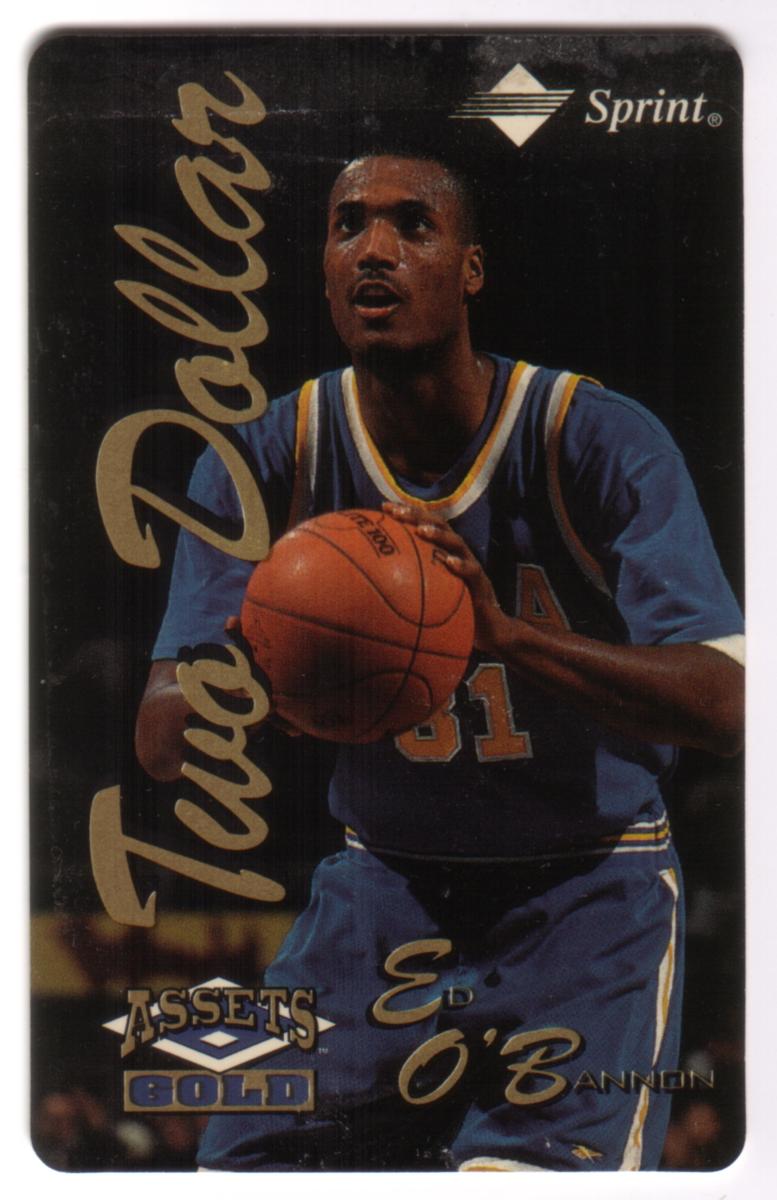 This collectible card features Ed O'Bannon, a basketball player wearing a blue UCLA Bruins jersey with the number 31 visible on the front. He is shown gripping a basketball with both hands, positioned as if preparing to make a play. The card has a black background with a distinctive gold script text reading "Two Dollars" along the left side, indicating the card's value.