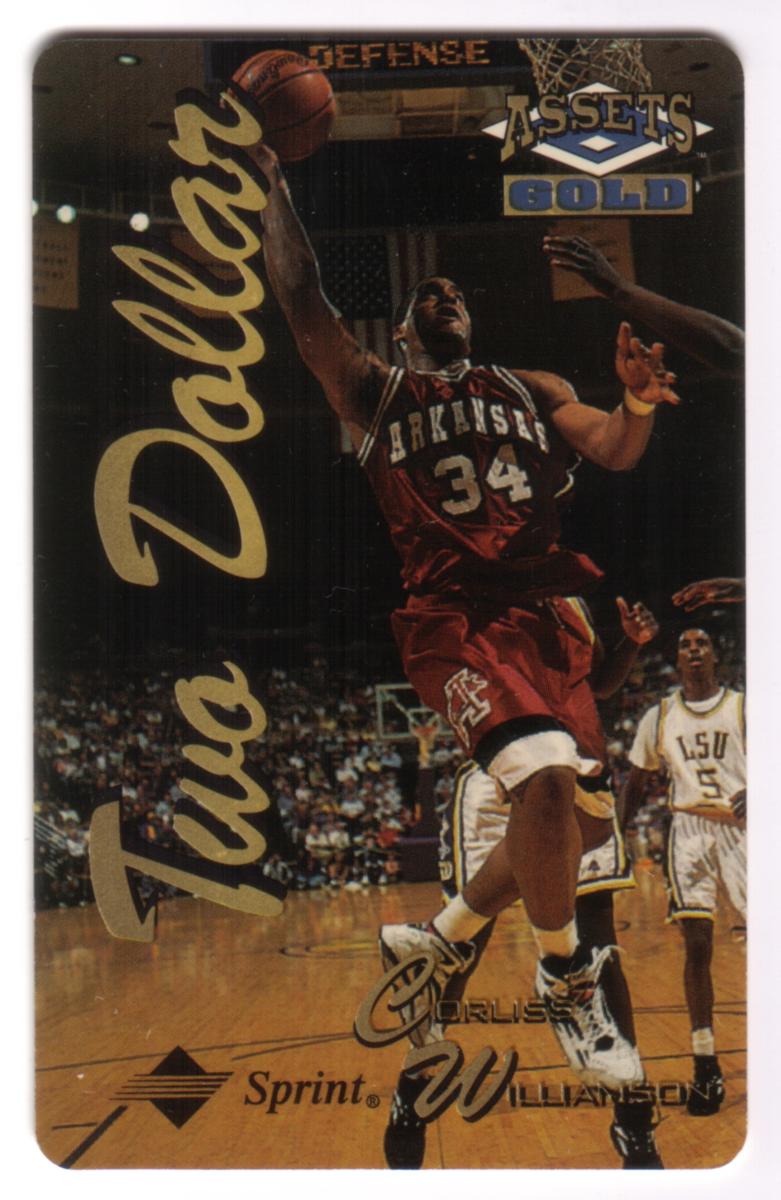 The card highlights college basketball within the NCAA framework, showing an active in-game moment that underscores Corliss Williamson’s athletic performance. The gold and black color scheme emphasizes the collectible nature and value of this sports phone card.