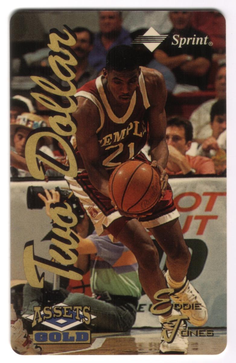 This collectible basketball card features Eddie Jones wearing a maroon Temple basketball uniform with the number 21 prominently displayed. He is captured in action, dribbling a basketball on the court during a game. The card includes the text "Two Dollars" in large gold script along the left side, indicating its value or denomination.