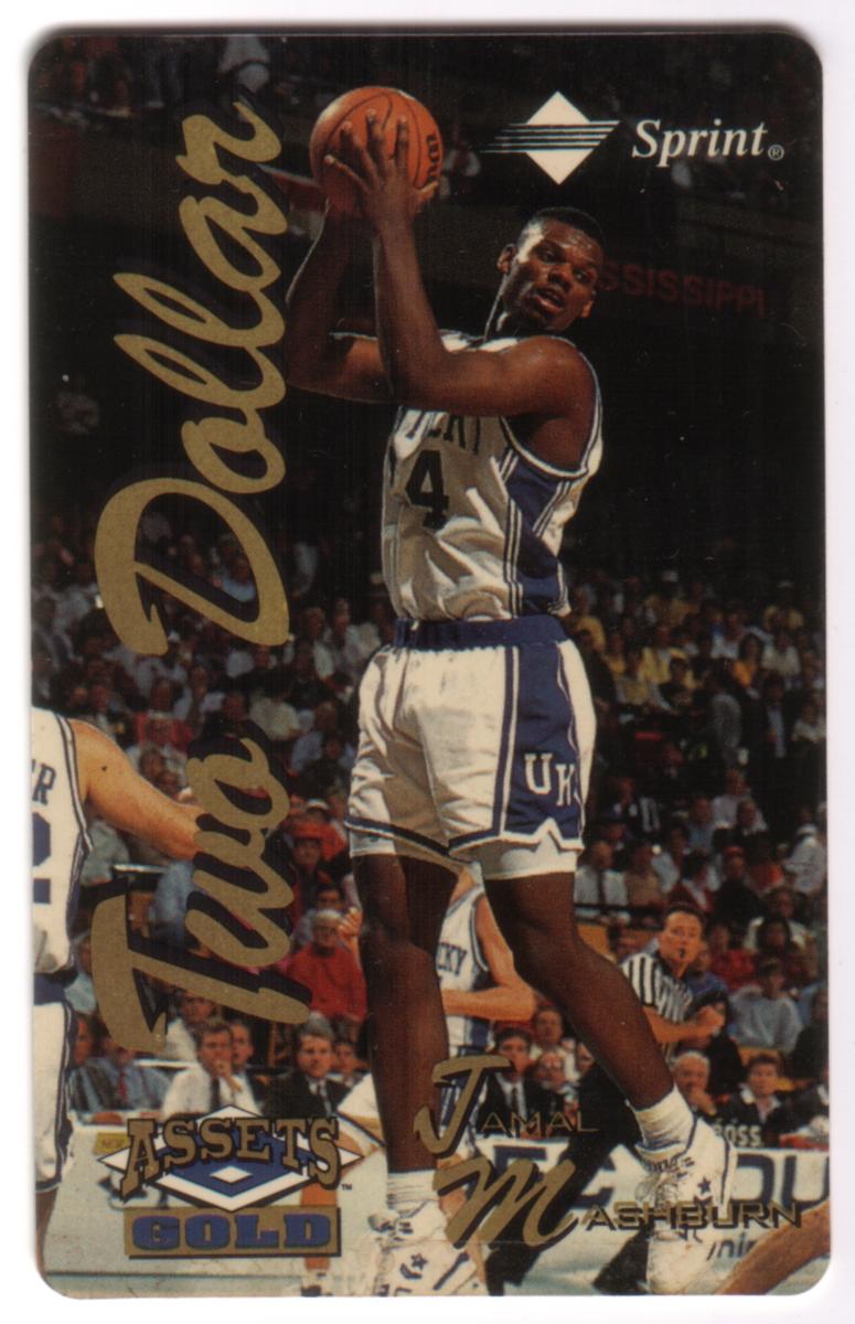 This collectible phone card features Jamal Mashburn, a basketball player, in action during a game. Jamal Mashburn is wearing a white and blue basketball uniform with "UK" visible on the shorts, indicating the University of Kentucky. He is shown jumping and holding a basketball above his head, preparing to shoot. The background shows a crowded arena with spectators watching the game.