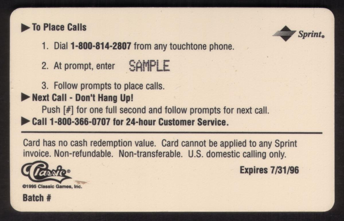 Since we have the world's largest inventory of USA phonecards for collectors, you will not necessarily receive the identical serial/batch/PIN number that we have scanned/pictured.