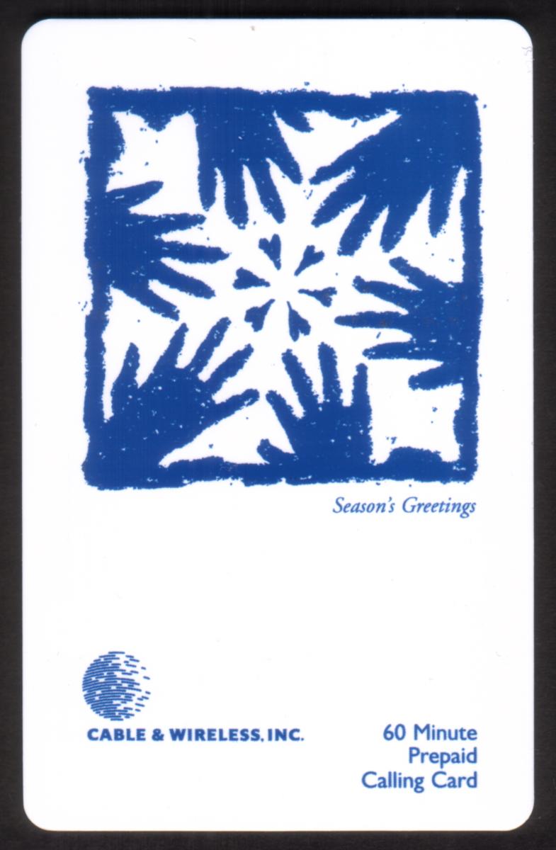This collectible prepaid calling card from Cable & Wireless, Inc. features a graphic design consisting of six blue handprints arranged in a circular pattern against a white background. The hands form an abstract snowflake shape in the center, symbolizing winter and the holiday season. Below the design is the text "Season's Greetings" in blue.