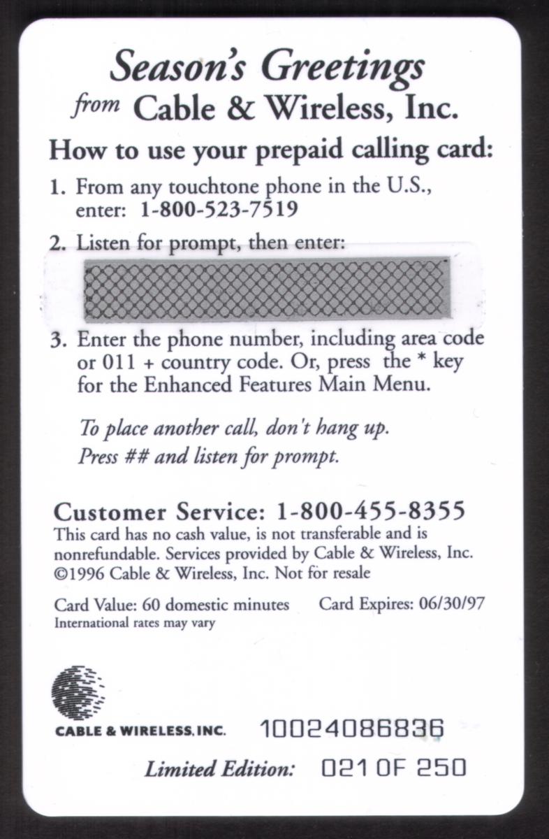 The bottom left corner displays the Cable & Wireless, Inc. logo, which includes a circular globe-like icon composed of many small blue dots. Adjacent to the logo, the card specifies "60 Minute Prepaid Calling Card" in blue text, indicating the card’s usage for 60 minutes of prepaid telephone calls.
