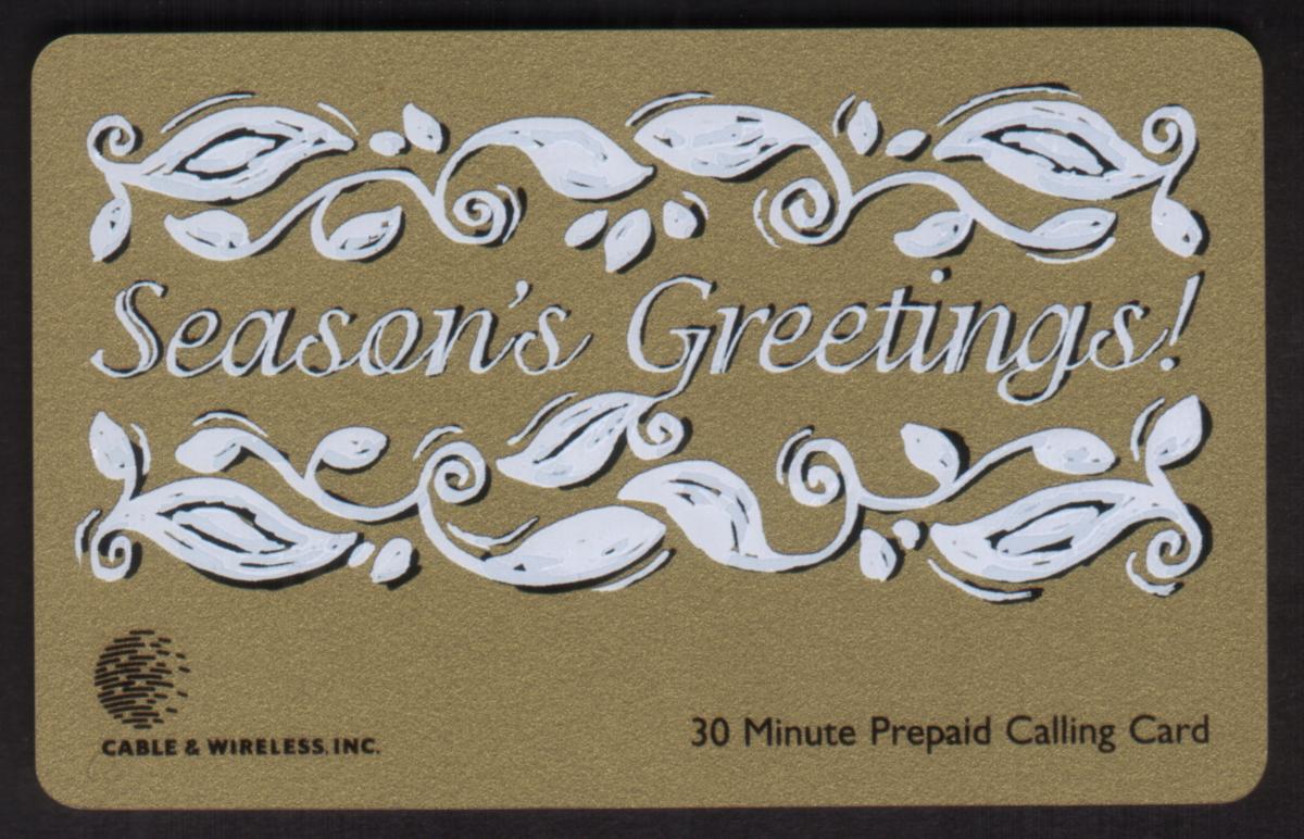 This collectible card is linked with Cable & Wireless (CWI), a telecommunications company, highlighting the holiday greetings for the year 1997. The card’s purpose as a phone card is indicated by subtle design elements consistent with telecommunications cards from that era, combining functionality with a seasonal aesthetic suitable for collectors and holiday use.