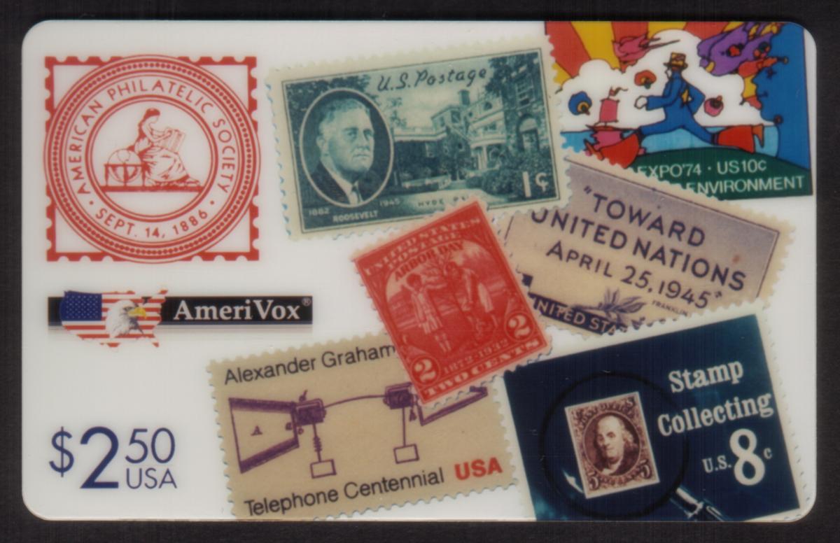 The lower left corner prominently shows the denomination "$2.50 USA," along with a small American flag and the logo for "AmeriVox." In the upper left circle, the text "AMERICAN PHILATELIC SOCIETY • SEPT. 14, 1886" is visible, emphasizing the card’s connection to philately and stamp collecting. This card represents themes around American history, postage stamps, and philatelic appreciation.