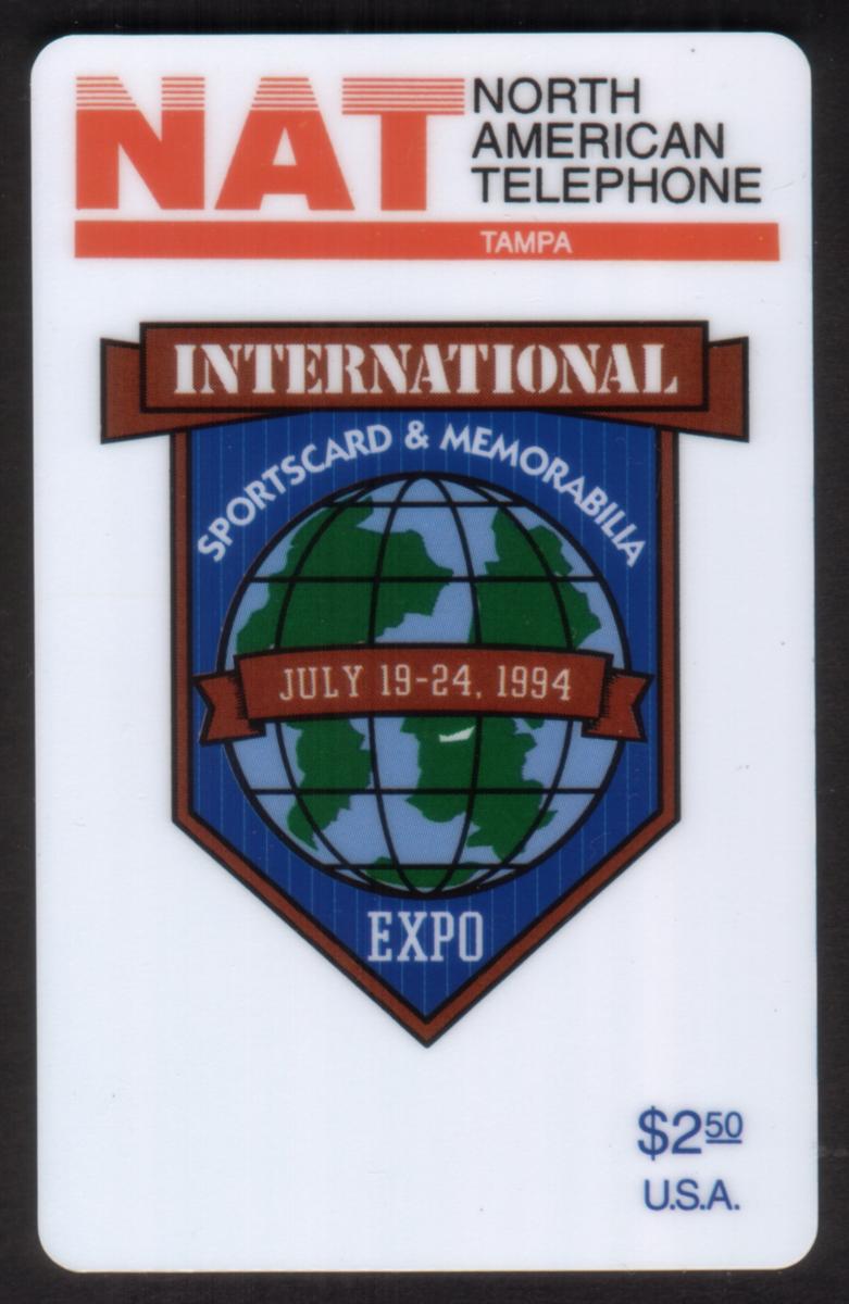 This card is marked as a complimentary prototype related to the International Sportscard & Memorabilia Expo held in Tampa, Florida. It is part of the North American Telephone series.