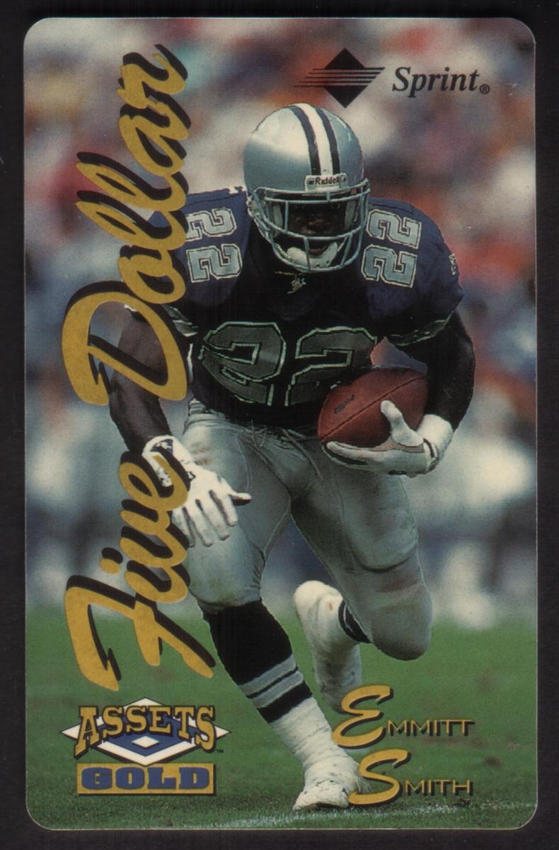 The design includes the Dallas Cowboys team colors, with a focus on blue, silver, and white. The top right corner contains the Sprint logo, indicating the phone card issuer. Near the bottom left corner, there is a gold emblem labeled "ASSETS GOLD," confirming the card's series. The action image of Emmitt Smith on the field gives this card a sporty and dynamic appearance suitable for fans and collectors of NFL memorabilia.