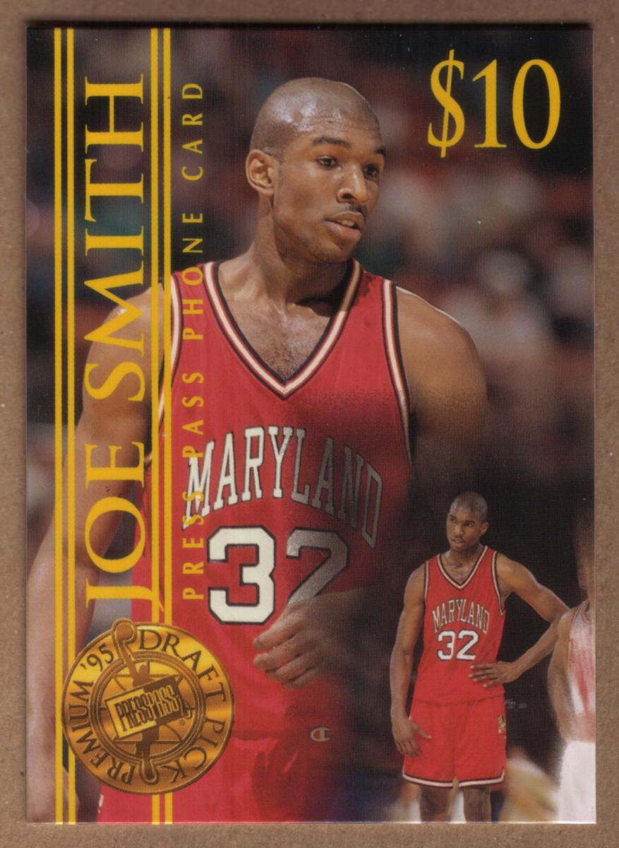 The card is issued by Global Tel. Solutions and is linked to the Sport of Basketball. It highlights Joe Smith as a premium draft pick from 1995 and is valued at $10, making it a specific collectible within the 1995 classic marketing series.