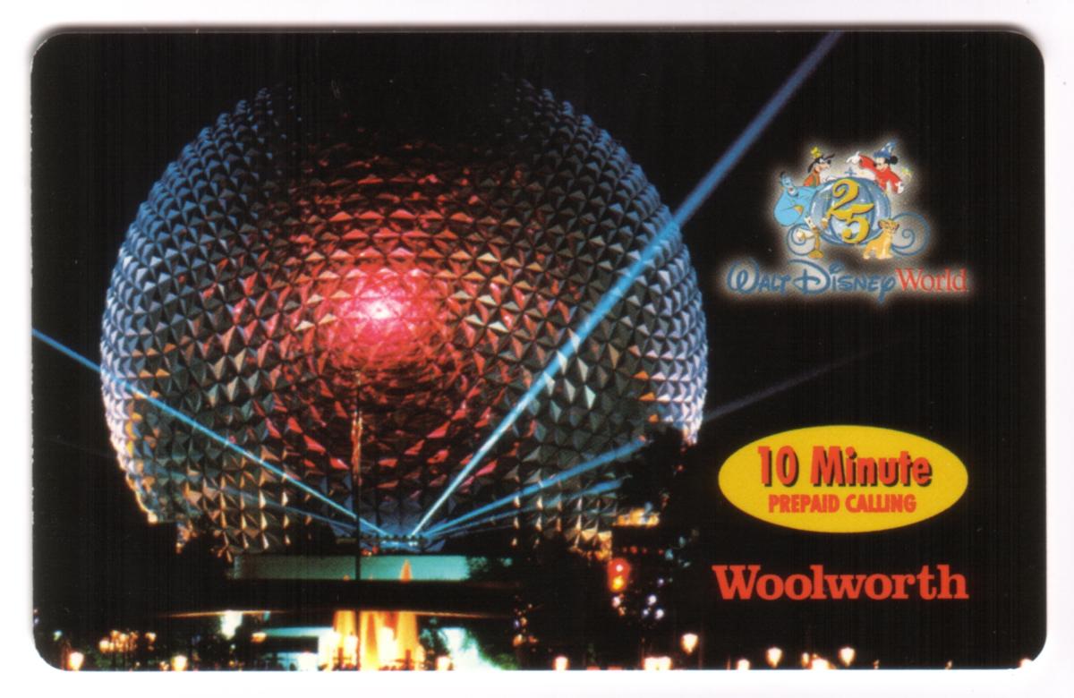 This phone card reflects the 1997 partnership involving Walt Disney, Woolworth, and Sprint, celebrating Walt Disney World's 25th anniversary. The imagery and branding focus on Florida attractions and Disney theme parks, specifically highlighting the famous Spaceship Earth attraction at Epcot Center.