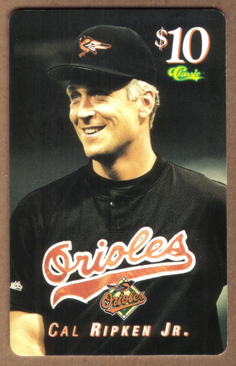 This collectible card features Cal Ripken, Jr., a Major League Baseball player known for his career with the Baltimore Orioles. He is pictured in a close-up wearing a black shirt against a background featuring a scoreboard marked with "GTE," a telecommunications company. The card prominently displays the MLB logo and Orioles team branding. The value of the card is $10, which is printed clearly as part of the card’s design.