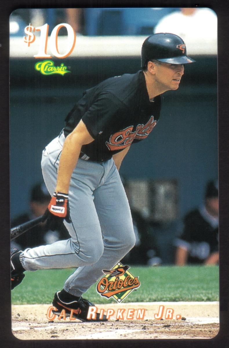 This collectible card features Major League Baseball player Cal Ripken, Jr. prominently in action. Cal Ripken, Jr. is shown in a dynamic running pose after hitting the ball, exemplifying his athleticism and skill on the baseball field. He is wearing the classic Baltimore Orioles uniform, highlighting his connection to the MLB team. The image captures him mid-motion, emphasizing his legendary playing style in baseball.
