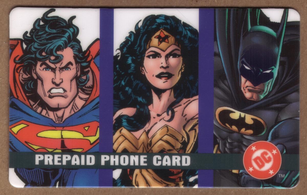This collectible prepaid phone card from 1995 features bold, colorful portraits of three iconic DC Comics superheroes: Superman, Wonder Woman, and Batman. Superman is displayed on the left side of the card with his classic blue suit, red cape, and the yellow and red "S" emblem prominently shown on his chest. His expression is intense and determined, with his dark hair styled in signature waves.