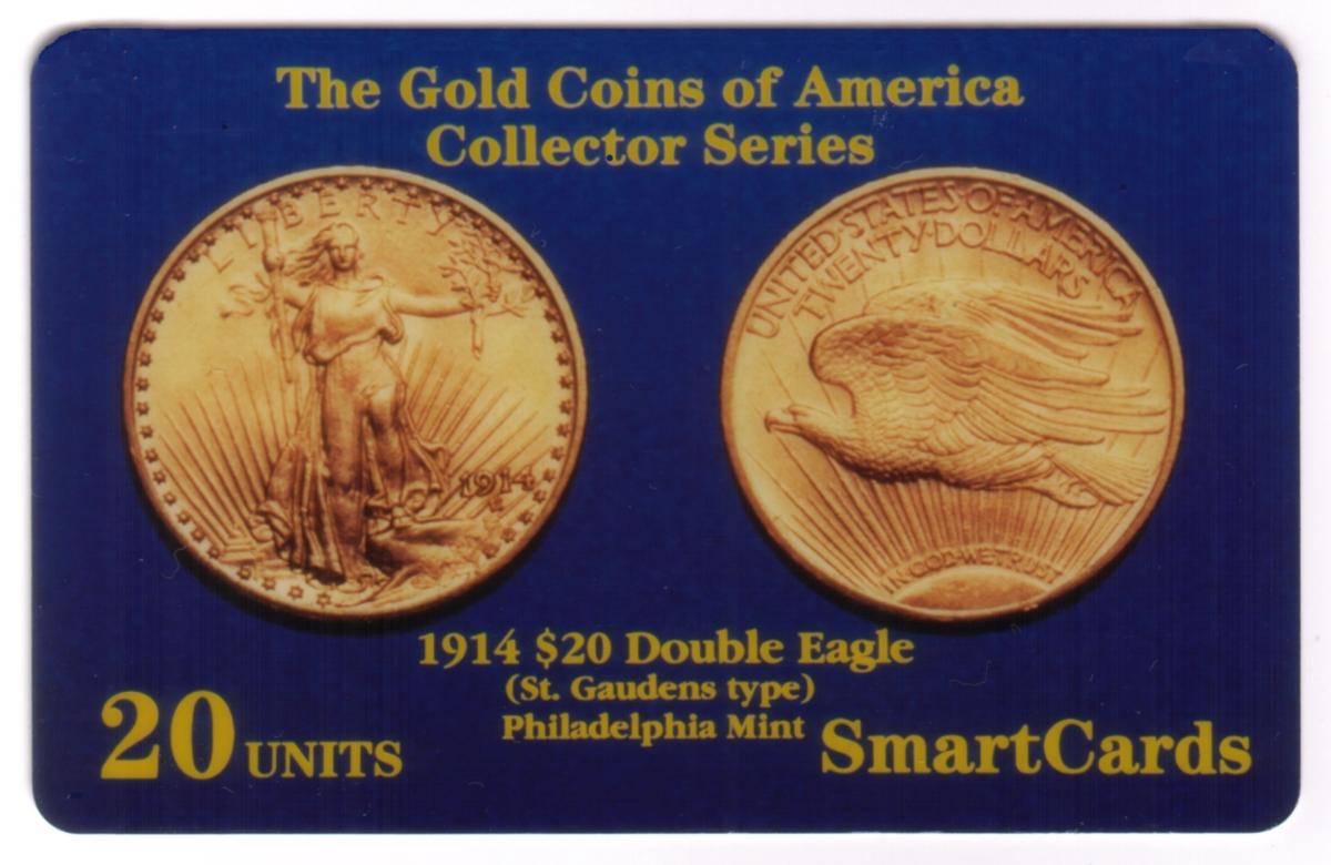 The card's layout includes the text "ATHENA 20U 1914 $20. Double Eagle Gold Coin Picture (St. Gaudens)" printed in a clear and readable font. The branding "SmartCards, Inc." is also present, indicating the producer of the collectible card. The card’s design focuses on the celebration of rare numismatic items, specifically gold coins, appealing to collectors interested in money, coins, and numismatics.