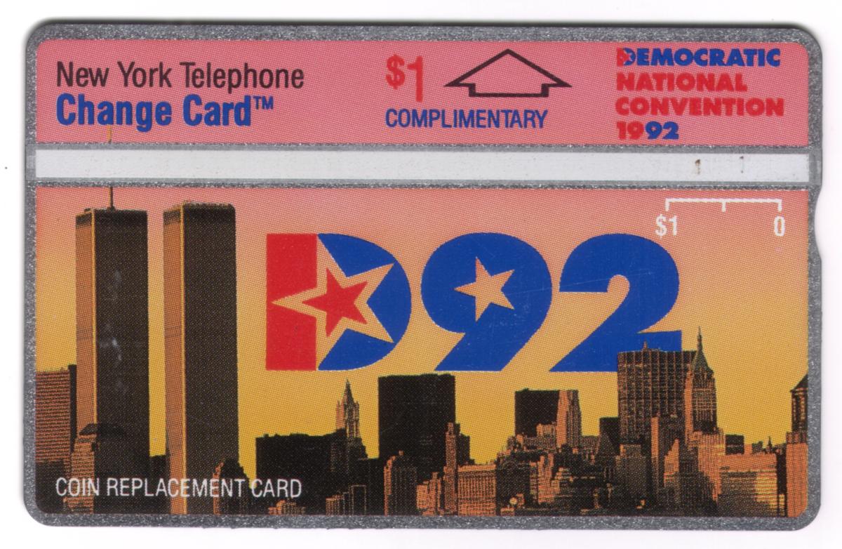 A 1992 New York Telephone memorabilia card featuring NYC skyline, Twin Towers, patriotic stars, and a sunset glow, celebrating the Democratic National Convention. |