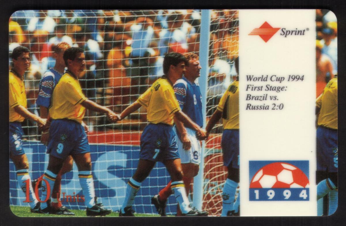 Prominently displayed on the card are the logos for the event and relevant sponsors. The text on the card includes “World Cup USA 1994” and references the match between Brazil and Russia that took place in August 1994. Additional branding includes the Sprint logo, indicating sponsorship or promotional partnership related to the card. The card’s design incorporates strong colors and sharp photography that highlight the significance of the international soccer tournament.