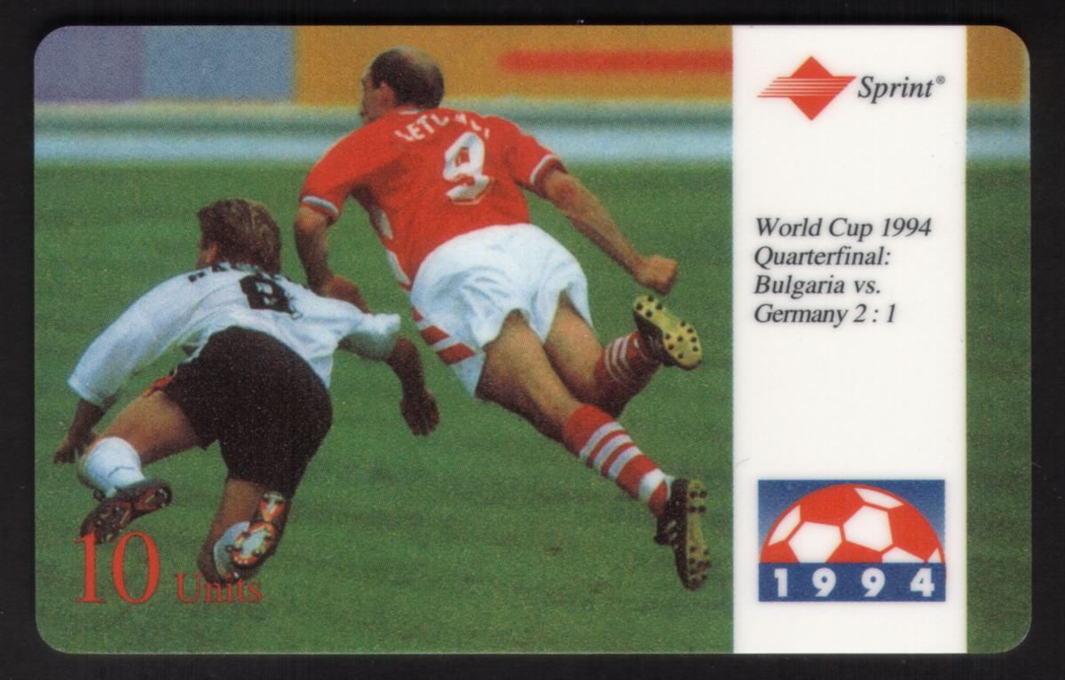 The card includes the text "WorldCupUSA94" and "10u Soccer Int'l World Cup USA 1994 Bulgaria vs Germany 08/95 USED" prominently displayed. The Sprint logo is visible, indicating the telecommunications provider associated with this collectible item. The card is utilized, as noted by the word "USED."