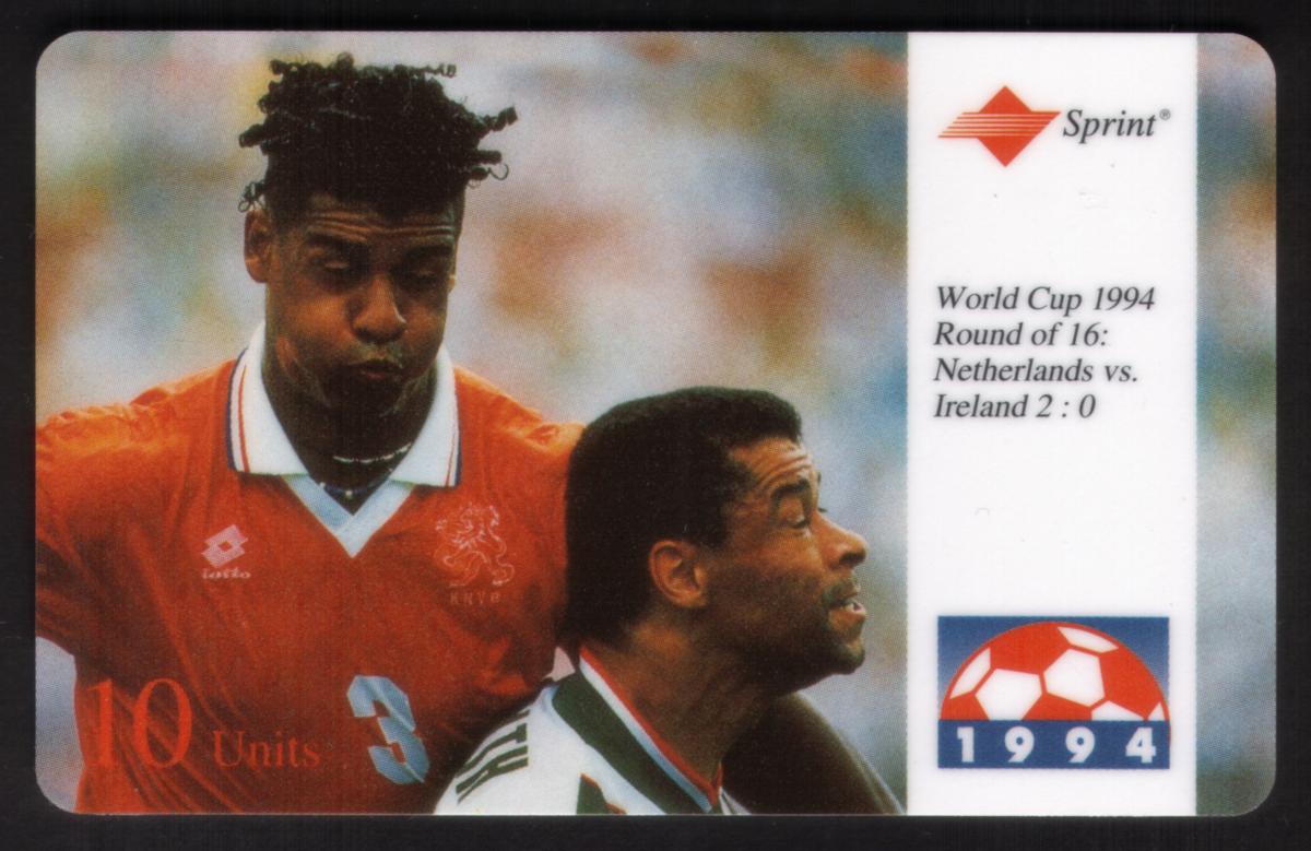 On the card, text indicates "Irish 10u Soccer Int'l World Cup USA 1994 Netherlands vs Ireland 09/95 USED," confirming the event details and usage status. The card also includes the Sprint logo, identifying the telecommunications company associated with its issuance. The artwork and design emphasize the connection to the World Cup, with clear references to the sport of soccer (futbol) and the specific date related to the card's event or print.