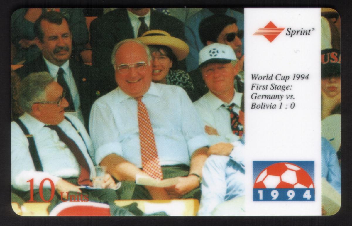 This collectible phone card features the official logo of the 1994 FIFA World Cup held in the United States at the top left corner. The main image highlights a dynamic soccer scene from the first stage match between Germany and Bolivia during the World Cup USA 1994. Two players are visible competing for the ball; one player is in a red and white uniform, and the other player is in white, representing their respective national teams. The background shows a stadium filled with fans, emphasizing the event’s lively atmosphere.
