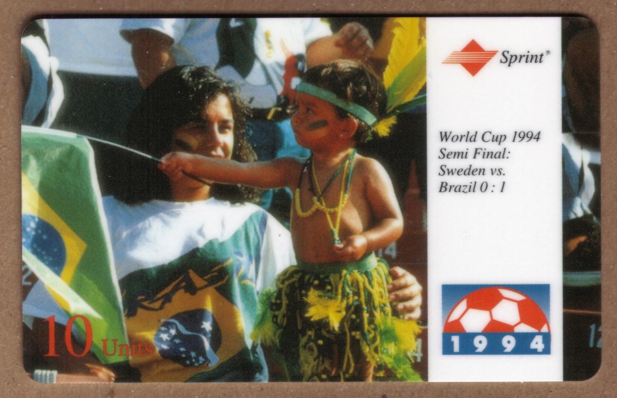 This collectible chip card features imagery related to the 1994 FIFA World Cup held in the United States. The card commemorates the semi-final match between Sweden and Brazil that took place during the tournament. The front of the card displays the official World Cup USA 1994 logo prominently in the upper left corner. Along the bottom of the card, the text reads "10u Soccer Int'l World Cup USA 1994" and "Sweden vs Brazil 02/96 USED," indicating the specific match focus and usage status.