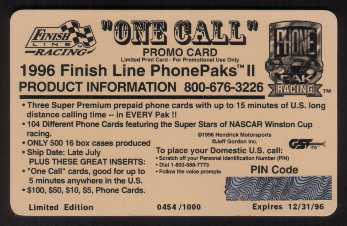 The card’s design includes the large gold-colored text at the top reading "ONE CALL" and at the bottom "PROMO," indicating its promotional nature. The lower left corner features the logo for PhonePak 2 (1997) and Finish Line Racing, connecting to the sports of auto racing and NASCAR. The background has a race day ambiance with a blurred crowd and banners, including Coca-Cola and Gatorade logos, aligning with the automotive racing theme.
