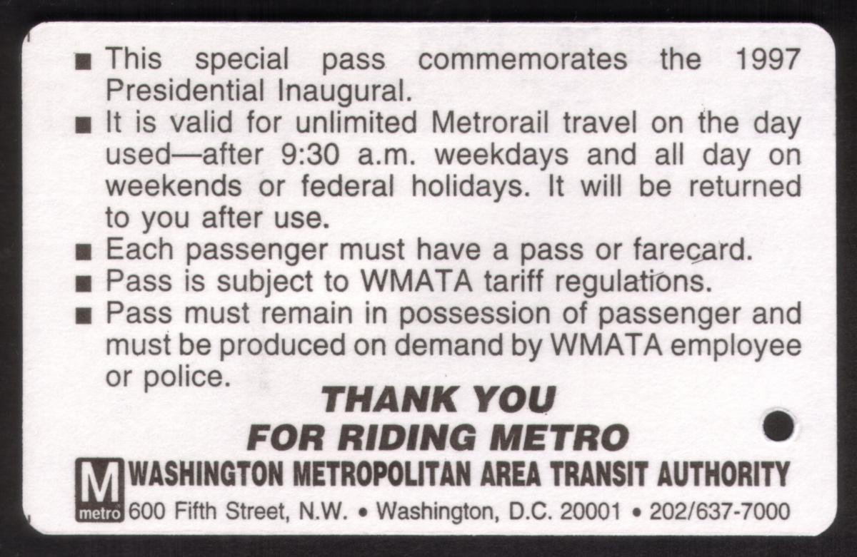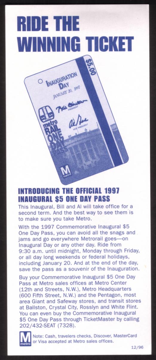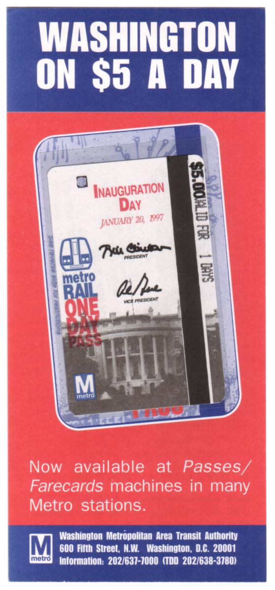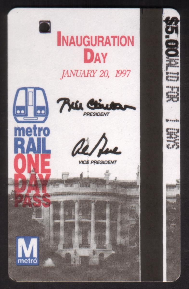 Signatures of then-President Bill Clinton and Vice President Al Gore appear in black ink near the center of the card, labeled with their official titles underneath. Along the right edge, "$5.00 VALID FOR 1 DAY" is printed vertically in black text, indicating the card’s value and limited usage period. The overall design commemorates the presidential inauguration of Bill Clinton and Al Gore in 1997, tying together iconic American political symbols and the Washington D.C. Metro transit system.