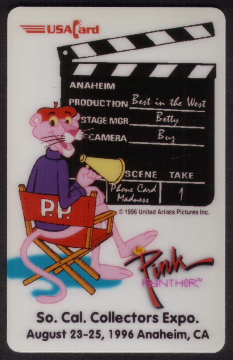 This card commemorates the Southern California Collectors Expo held in Anaheim in August 1996 and ties in themes of cartoons, animation, and collectible phone cards, spotlighting the iconic animated character Pink Panther in a film director role.