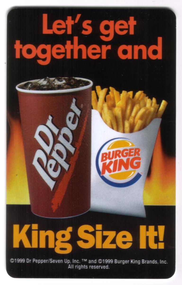 At the bottom edge, copyright text indicates the card was produced in 1999 by Dr Pepper/Seven Up, Inc. and Burger King Brands, Inc., ensuring the authenticity of the promotional material. The card is associated with a Burger King Fries and Dr Pepper promotional campaign.