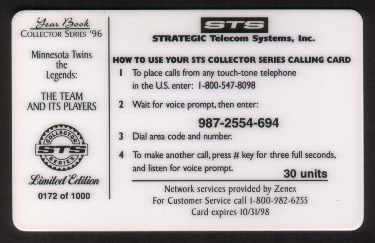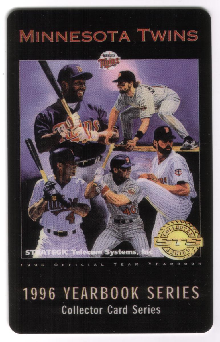 This card is part of the 1996 Yearbook Series by Strategic Telecom Systems, Zenex, highlighting the Minnesota Twins baseball team. It is a collector card that celebrates the team with a focus on key players and official branding from that season. The card serves as both a sports memorabilia item and part of the larger collector series dedicated to baseball.