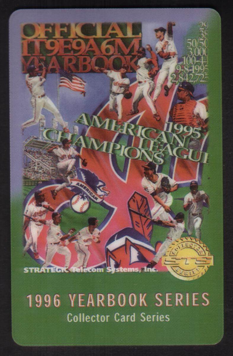 This collectible phone card features the 1996 Yearbook Series celebrating the Cleveland Indians as the 1995 American League Champions. The card design prominently displays multiple images of Cleveland Indians baseball players in various action poses surrounding the large, stylized red "C" logo associated with the team. The background includes a partial view of the baseball field and stadium seating. The title "OFFICIAL 1996 YEARBOOK" appears at the top in gold lettering, with the phrase "1995 AMERICAN LEAGUE CHAMPIONS" diagonally placed across the center in green letters.