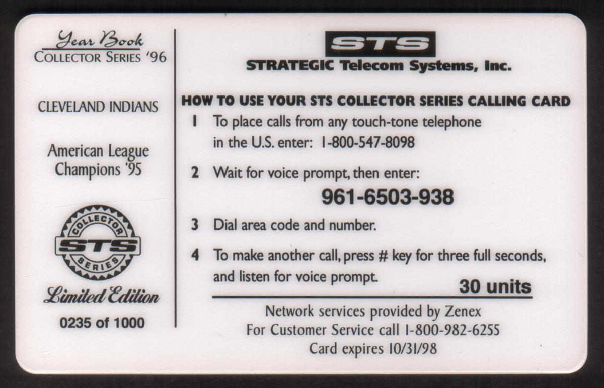 This phone card is part of the Zenex Collector Series and honors the 1995 Cleveland Indians baseball team, capturing their championship status through vivid imagery of key players and team symbols. It highlights the historic moment for the team in American League baseball during that era.