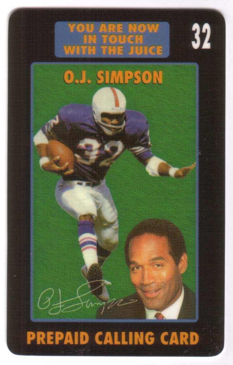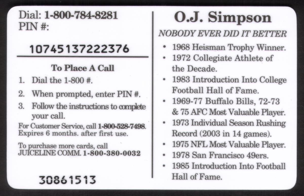 This prepaid calling card was issued by Juiceline Communications Inc. It celebrates Simpson's legacy in football by combining both his on-field action and a formal portrait, making it a distinctive collectible item dedicated to the sports icon.