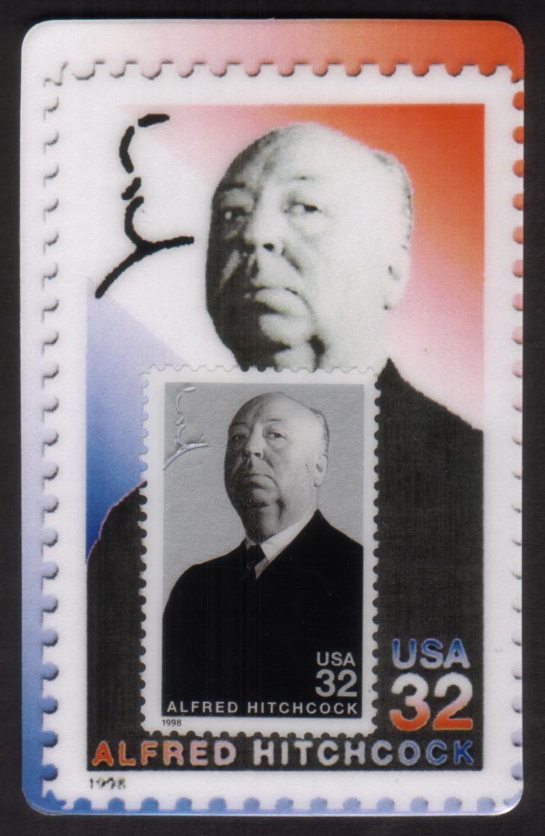 This collectible card features a 32-cent Alfred Hitchcock postage stamp from the United States. The stamp includes a black-and-white portrait of Alfred Hitchcock wearing a suit and tie. The name "ALFRED HITCHCOCK" is printed at the bottom of the stamp along with "USA 32."