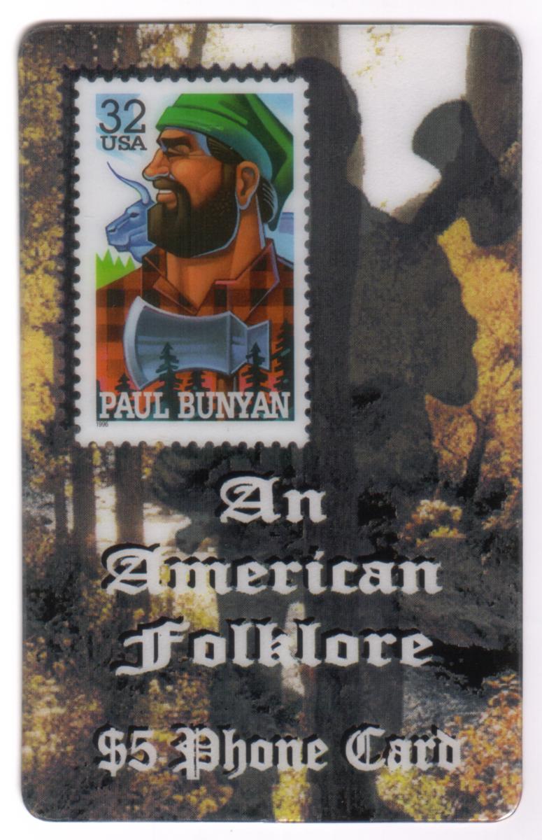 This collectible phone card features a detailed image of a 32-cent USA postage stamp depicting Paul Bunyan, a legendary American folk hero known for his lumberjack feats. The stamp shows Paul Bunyan in profile with a green cap and a red plaid shirt, with an axe resting on his shoulder. Below the stamp, the card has white Gothic-style text stating, "An American Folklore $5 Phone Card."