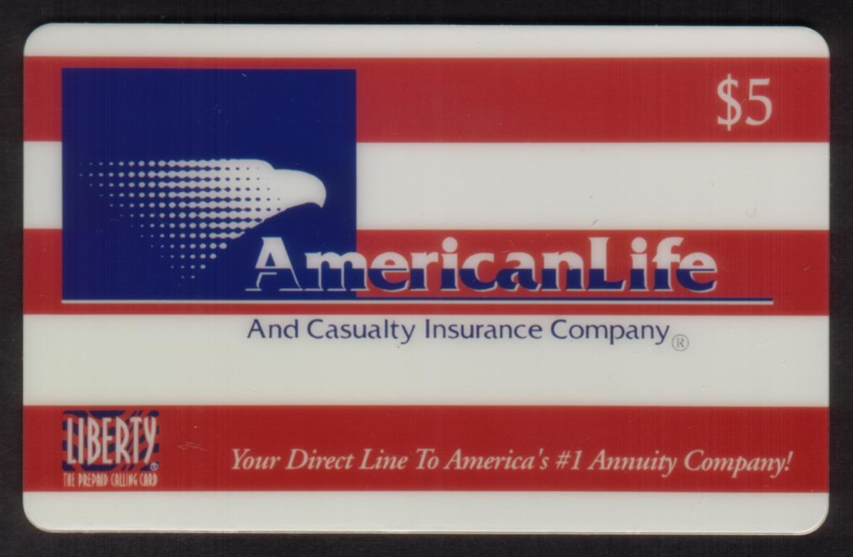 This collectible card features a design themed around American Life And Casualty Insurance Company. The front side prominently displays an eagle head graphic in white against a blue square background in the upper left corner. The text "AmericanLife" is centered on the card with a stylized font where the letters "American" and "Life" are fused together, each appearing in blue and red with a shadow effect.