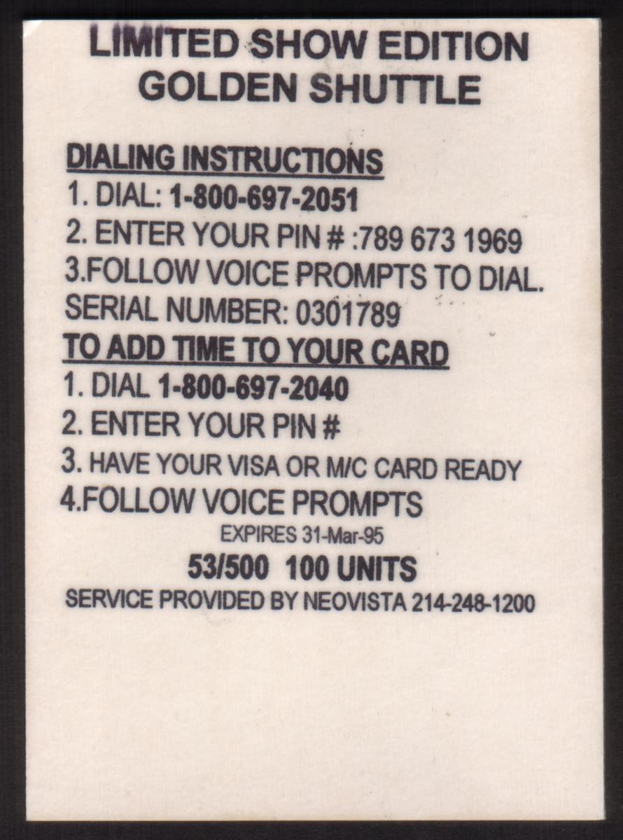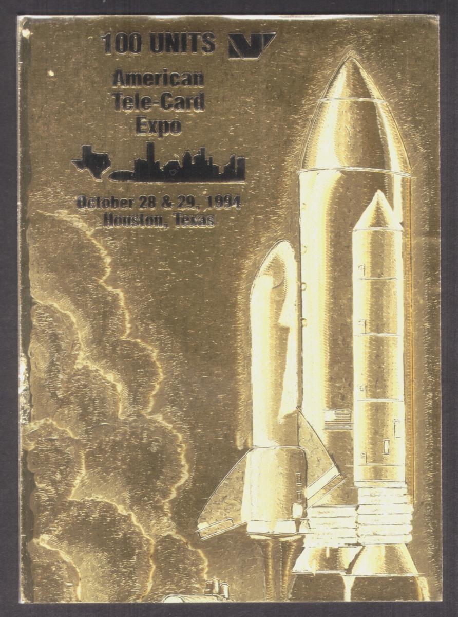 The telecard commemorates the American Tele-Card Expo held in Houston, Texas in late October 1994. The card combines the themes of space exploration and telecommunications, referencing NASA’s iconic Space Shuttle. The gold color scheme gives the telecard an exclusive, commemorative appearance.