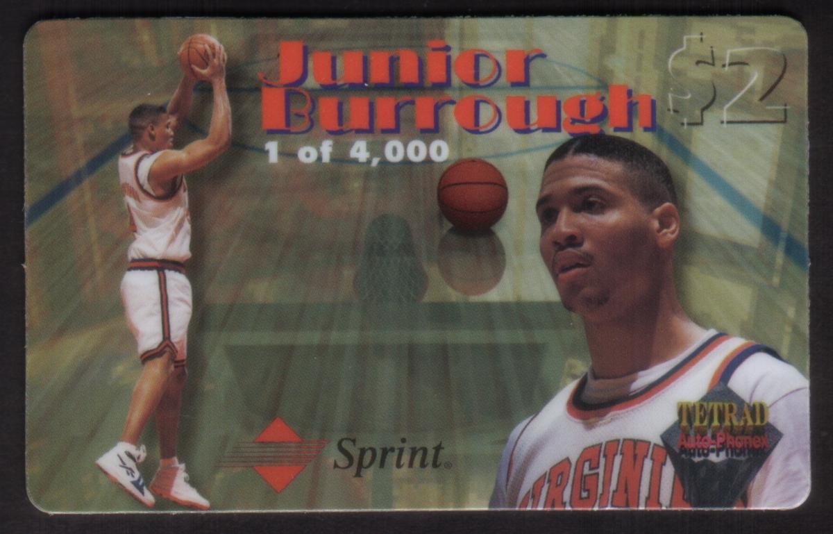 The card has a $2 value printed on it, indicating it is a prepaid phone card. The design includes a Sprint logo, linking the card to the Sprint telecommunications provider. The card’s background has a gradient with dark blue and black tones, featuring a subtle basketball graphic behind the player. The name "Junior Burrough" is clearly printed in white text along the lower part of the card, under the words "Auto-Phonex" and "Tetrad Basketball."
