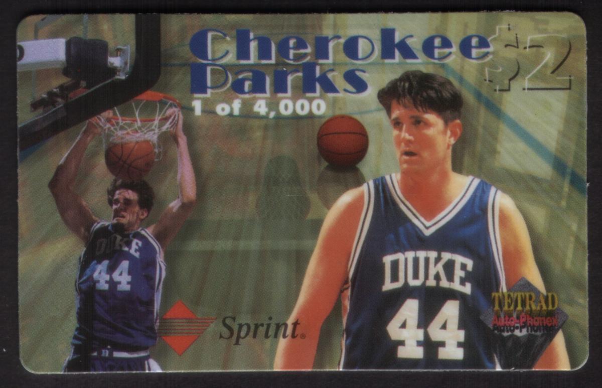 This collectible basketball card features Cherokee Parks, a professional basketball player, prominently displayed in action. The card represents the sport of basketball and carries a $2 value. It includes the branding of Auto-Phonex Tetrad and Sprint, indicating official licensors or sponsors connected to this collectible.