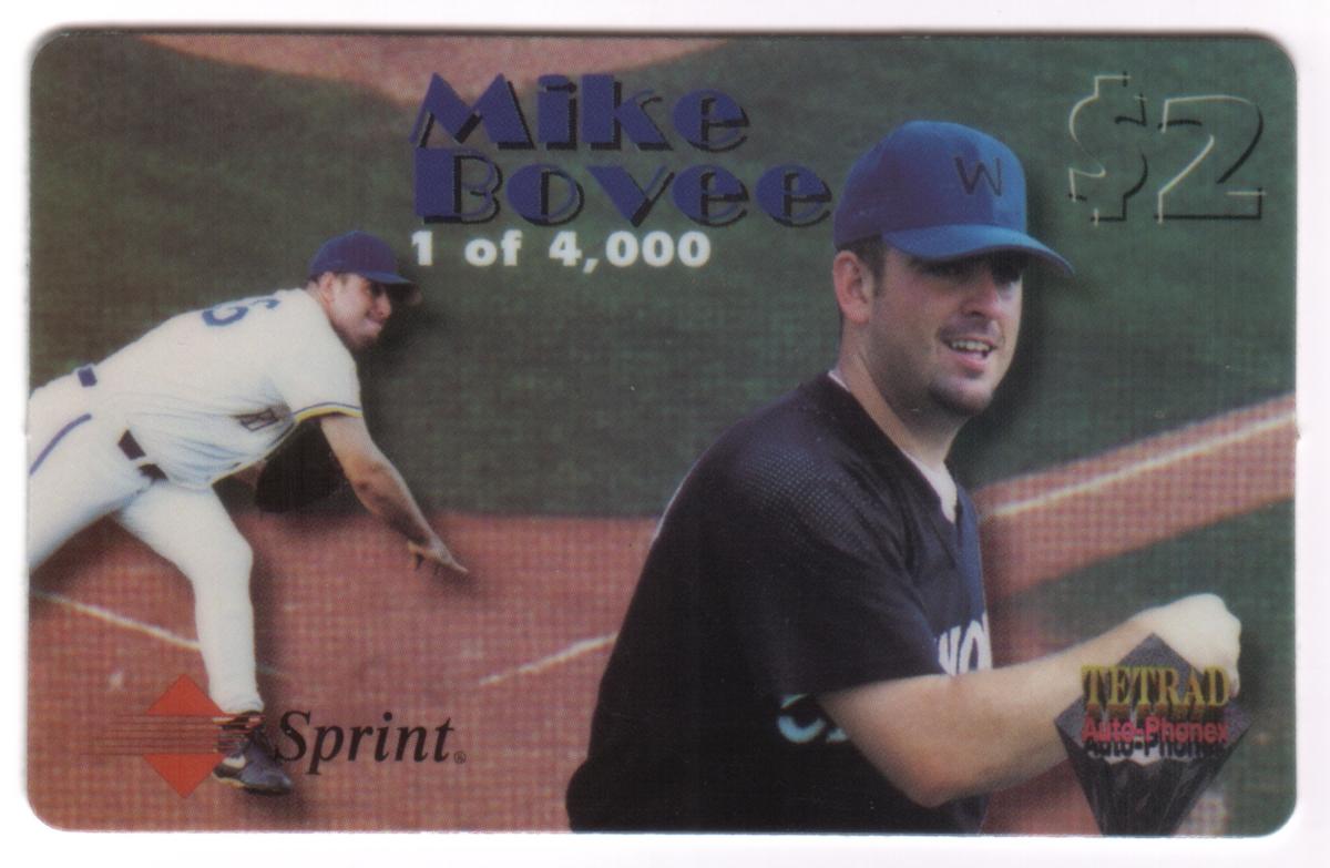 This card represents a specific, factual collectible within the realm of baseball trading cards, emphasizing Mike Bovee as the featured player and connecting to the Sprint Auto-Phonex Tetrad Baseball collection with a clear $2 denomination.
