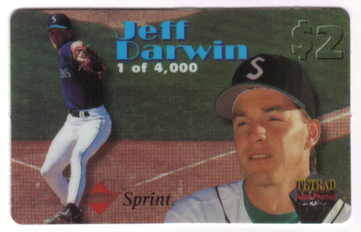 Overall, this card combines collectible sports memorabilia elements with telecommunications branding. It presents a vivid image of Jeff Darwin in action and contains clear, printed text about the player and card type.