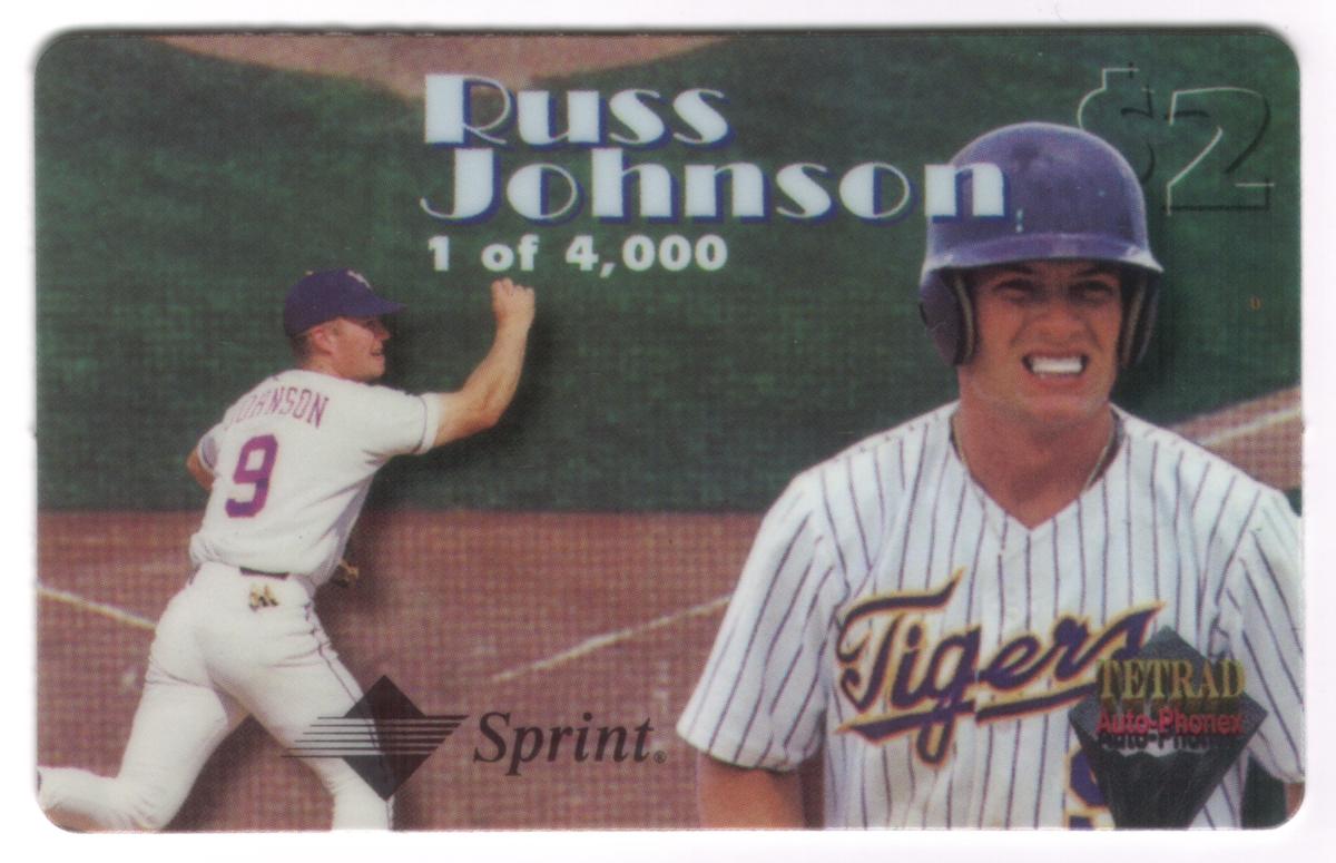 This card combines collectible aspects with sports memorabilia, making it a specialized item for baseball fans and collectors. The inclusion of corporate branding, such as Sprint and Auto-Phonex Tetrad, connects it to promotional campaigns or limited-edition collectible series tied to baseball players and players’ merchandise. The overall presentation emphasizes Russ Johnson’s connection to the Mobile BayBears and the sport of baseball.