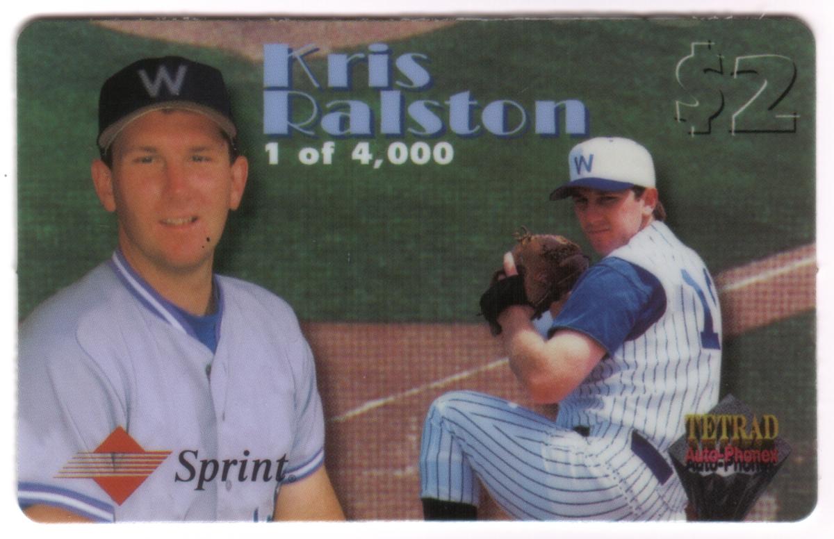This collectible phone card features Kris Ralston, identified by name on the card, wearing a baseball uniform with a "W" logo on the cap. Two images of Ralston appear: a portrait on the left and an action pose on the right showing him in a pitching stance wearing a pinstriped uniform. The card has a denomination of $2 indicated in the top right corner.