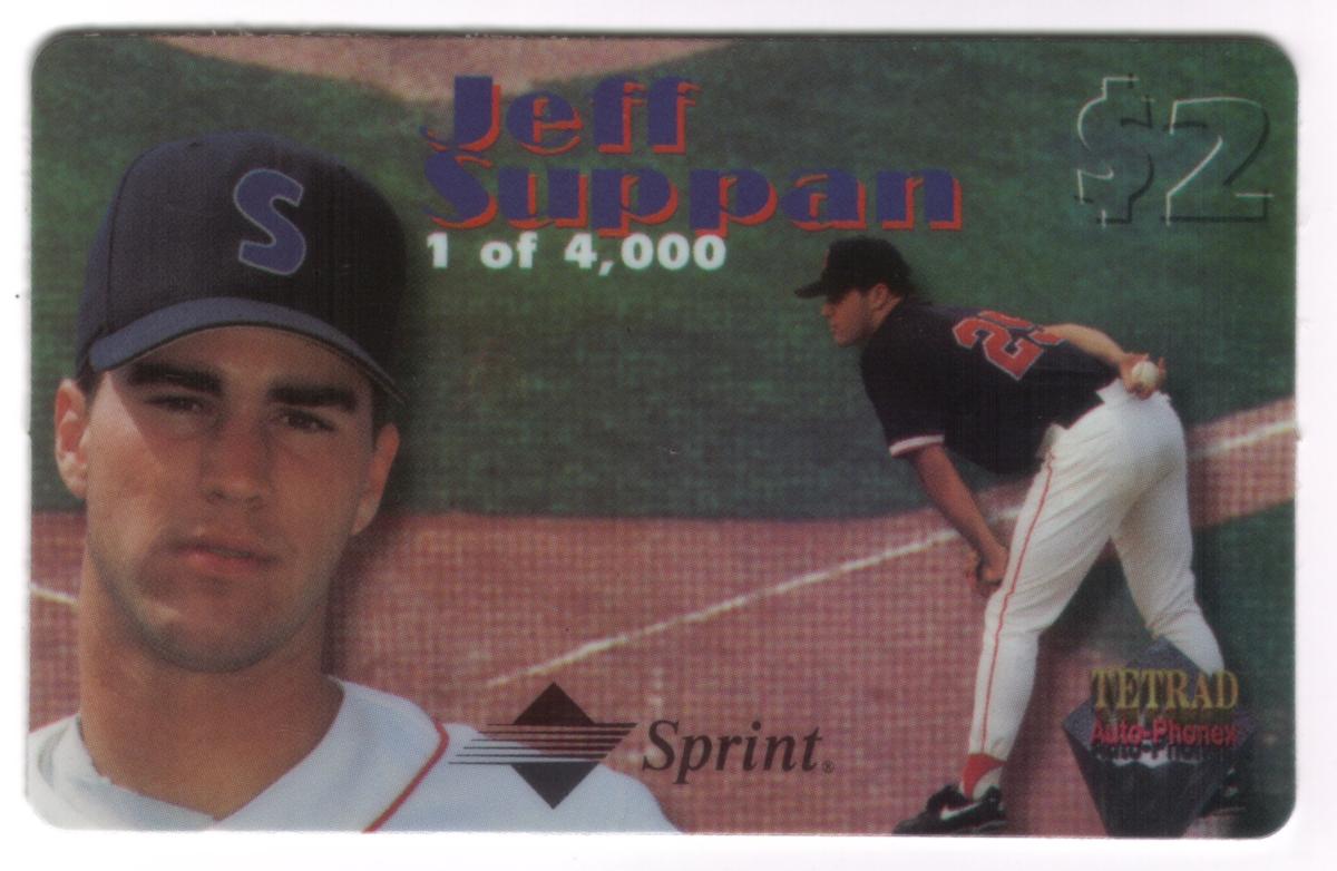 Text on the card includes Jeff Suppan’s name, his jersey number 36, and the $2 face value. The card’s layout balances the athlete’s image with branded elements and value indication, making it a collectible item for both baseball fans and phone card collectors.