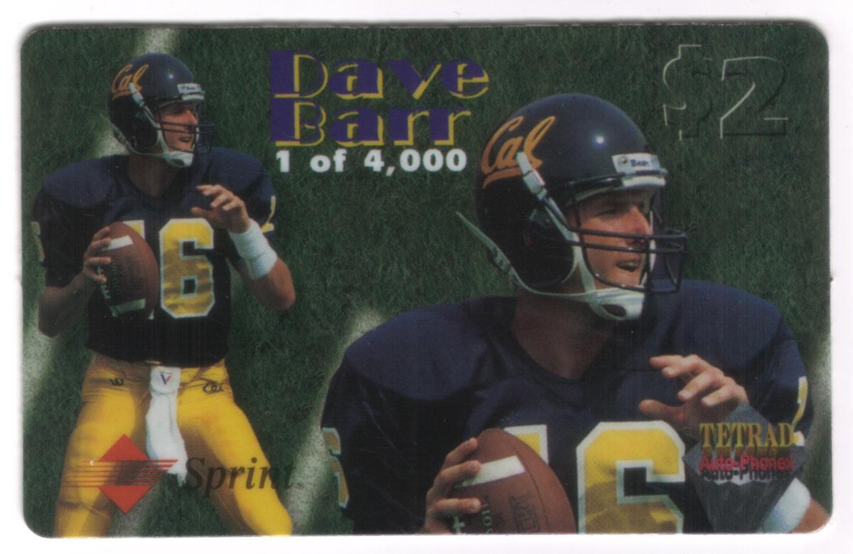 There are no other logos, team names, or additional text visible on the front of the card besides the information related to Dave Barr, the denomination, and the card series title. The card uses a straightforward design focused on the football theme and the featured player.